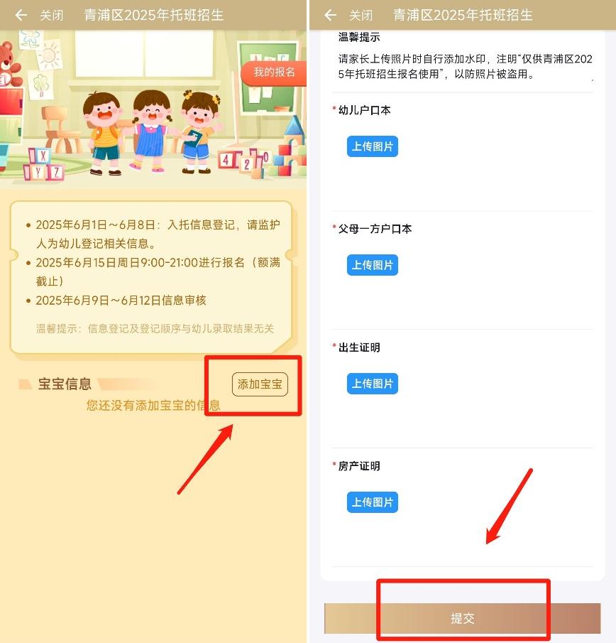 5.点击“添加宝宝”按钮,进行宝宝信息登记(请家长上传照片时自行添加水印,注明“仅供青浦区2025年托班招生报名使用”,以防照片被盗用。)填写信息完成后,点击“提交”,等待审核结果。审核结果将以短信的形式通知,家长也可在服务页面自行查看审核结果。如发现宝宝信息填写有误,请在信息登记时间段内进行修改,逾期将无法修改。