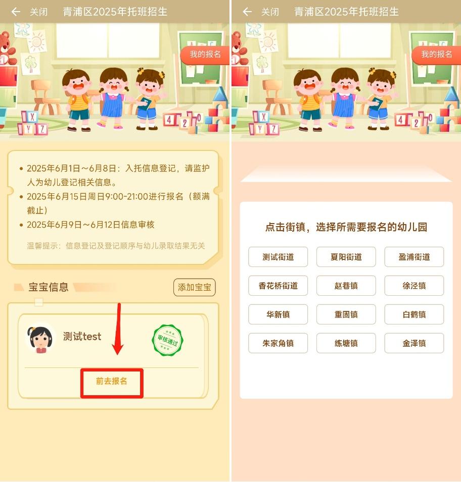 (二)正式报名:2025年6月15日9:00-21:00(额满为止)1.宝宝信息审核通过的家长点击“前去报名”按钮。点击街镇,选择所需要报名的幼儿园