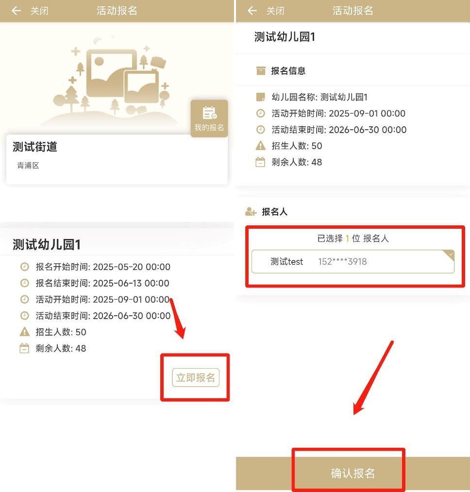 2.在对应幼儿园右下角点击“立即报名”,勾选宝宝,点击“确认报名”即可