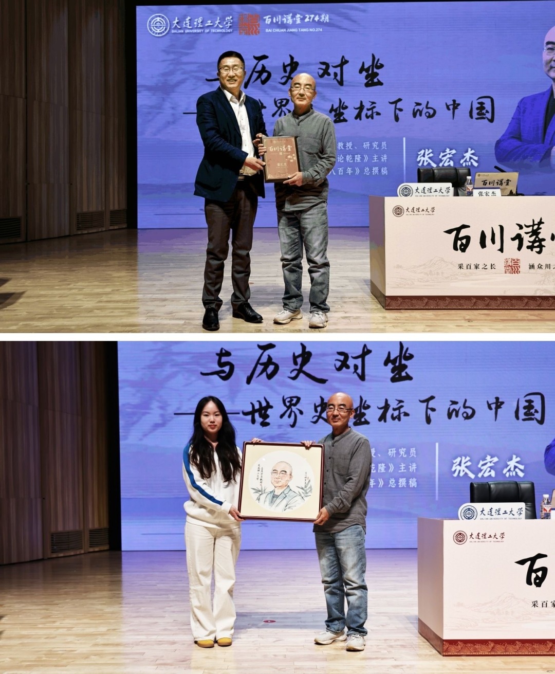 讲座最后,党委常委、宣传部部长韩轶代表学校为张宏杰颁发“百川讲堂”纪念牌,学生代表赠送国画肖像,以表感谢与敬意。