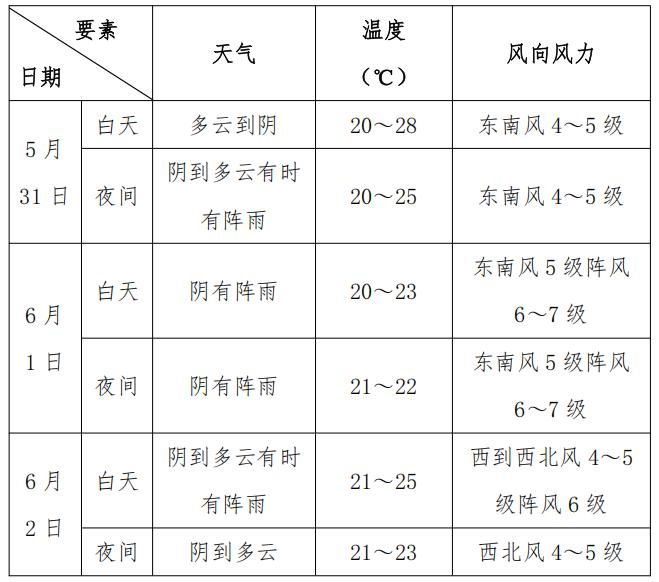 降雨:预计5月31日白天以多云天气为主,夜间转为阵雨天气。主要降水时段出现在6月1日,雨量可达大雨,局部暴雨。2日上午仍有小雨天气,午后转阴到多云。