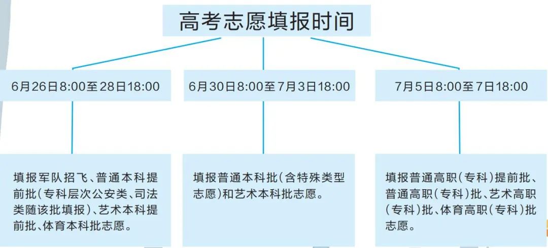 (1)6月26日8时至28日18时,填报军队招飞、普通本科提前批(专科层次公安类、司法类随该批填报)、艺术本科提前批、体育本科批志愿。(2)6月30日8时至7月3日18时,填报普通本科批(含特殊类型志愿)和艺术本科批志愿。