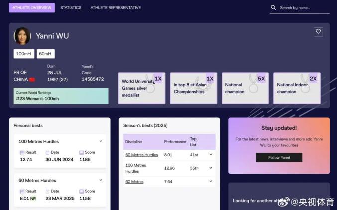 5月8日,国际田联最新排名公布,吴艳妮在女子100米栏项目中跃居世界第23位,刷新个人职业生涯新高,同时也是中国选手在该项目的世界排名纪录。