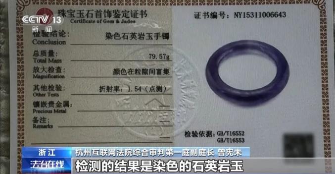 杭州互联网法院综合审判第一庭副庭长 曾宪未:检测的结果是染色的石英岩玉或是处理的翡翠。所谓珠宝鉴定证书