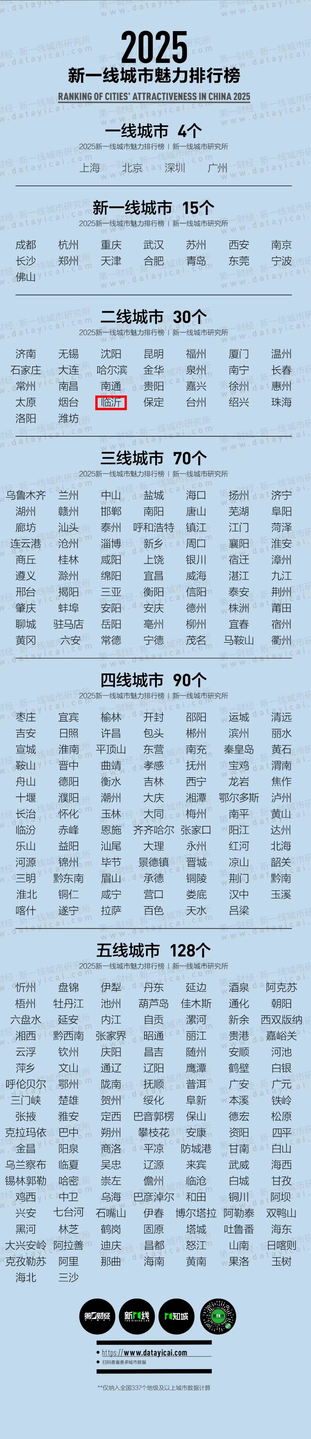 近日,新一线城市研究所发布《2025新一线城市魅力排行榜》名单,榜单显示,临沂位列二线城市。详情如下: