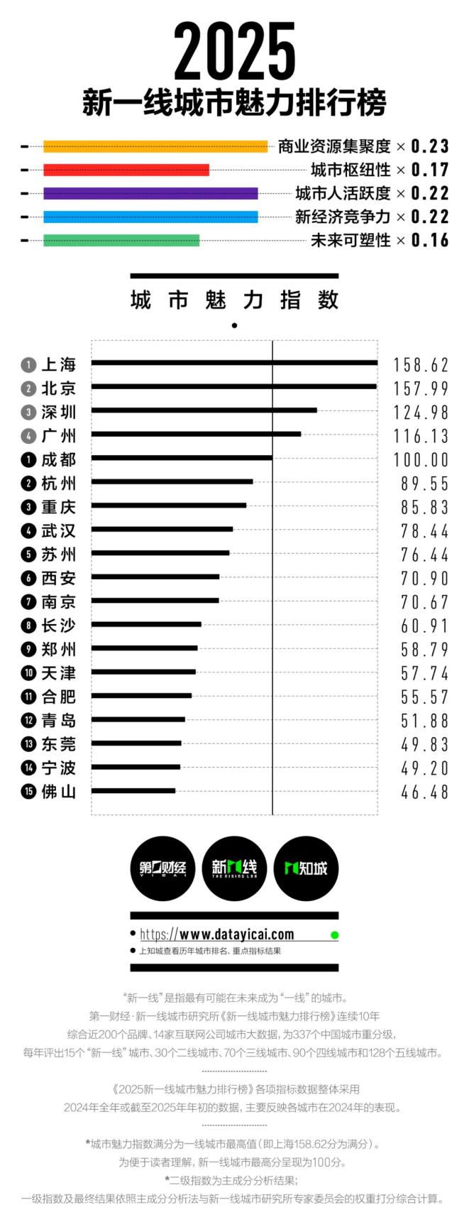 在排序保持稳定的4座一线城市上海、北京、深圳、广州之后,《2025新一线城市魅力排行榜》的15座新一线城市依次为:成都、杭州、重庆、武汉、苏州、西安、南京、长沙、郑州、天津、合肥、青岛、东莞、宁波与佛山。