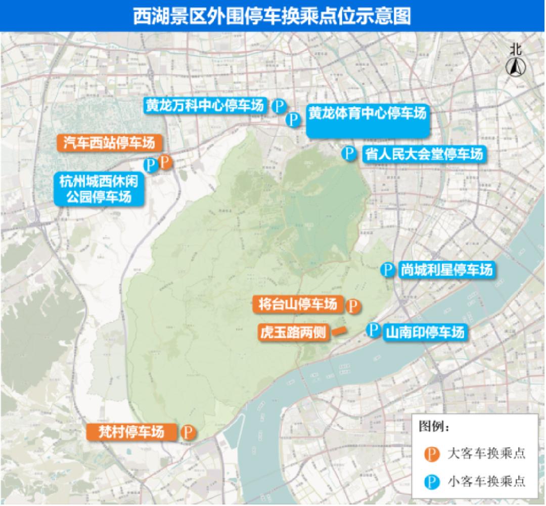 在景区外围设置了6处停车换乘点:省人民大会堂、城西休闲公园停车场、山南印停车场、尚城利星停车场、黄龙万科中心停车场、黄龙体育中心停车场提供小客车换乘公交服务,市民游客可换乘“小客车+公交”接驳线直达西湖景区内部景点;