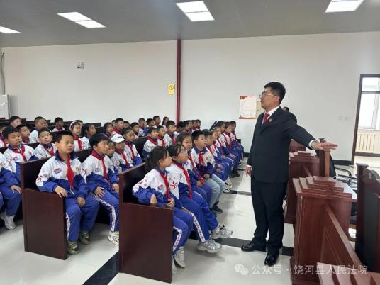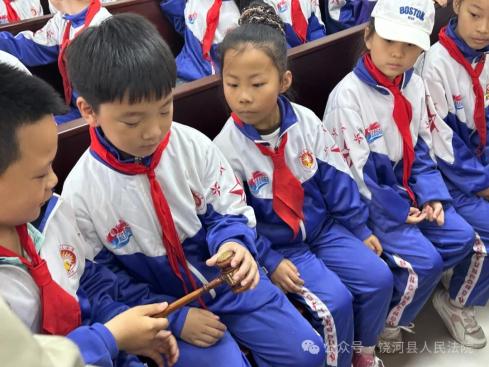 2025年5月16日,饶河县法院迎来一群“特别访客”——县第三小学的同学们走进法院,在法院干警的带领下,开启了一场民法典宣传月主题的“法治探险”,把审判现场变成互动课堂,让法律从抽象法条走向鲜活实践。站在法院门前的雕塑前,法官带孩子们开启“时空穿梭”。从春秋战国时期各个法学家的变法,到《民法典》;从李悝著有的《法经》,到现代法庭的科技审判台,孩子们时而蹲下细看浮雕纹路,时而举手发问。