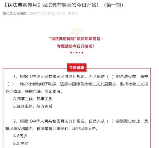为深入推进民法典学习宣传和贯彻落实,饶河县法院微信公众号举办“民法典进网络”法律知识竞答专题活动。从易到难的题目设计,可以逐步激发用户挑战欲望;评论顺序获奖的形式,营造紧张刺激的气氛;闯关成功后,会获得我院送送出的民法典相关书籍及衍生文创产品……此次活动将民法典知识普及与有趣的游戏问答结合起来,针对网络用户进行了精心设计,取得了良好的宣传效果。