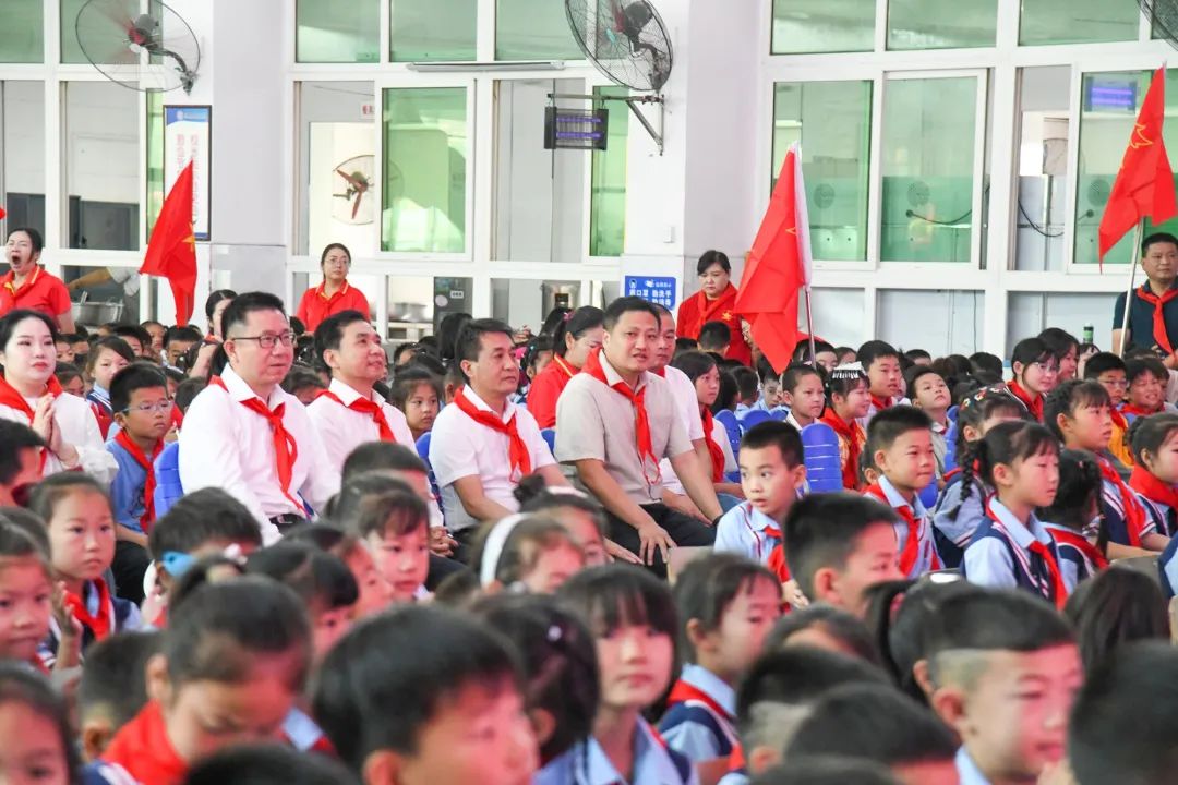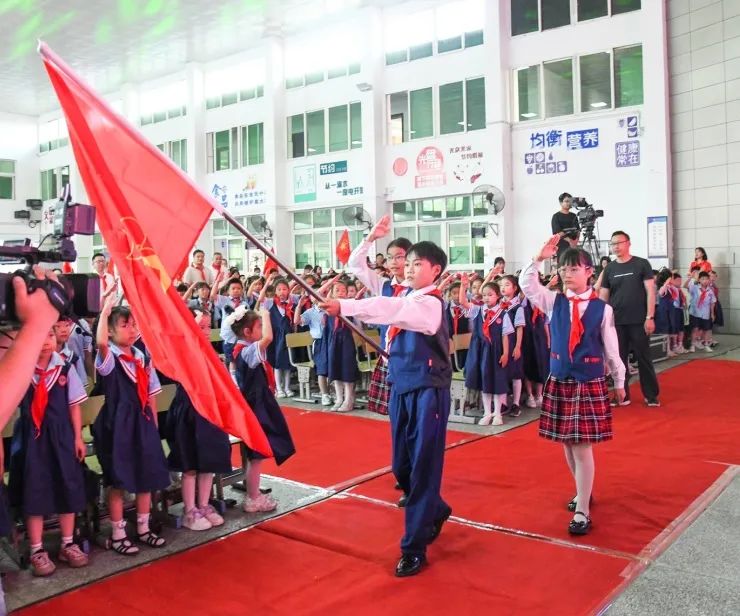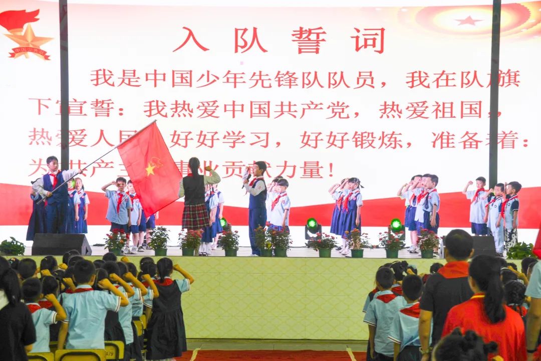 参加活动的相关负责人为一年级新队员代表佩戴上鲜艳的红领巾。新队员在大队长带领下在队旗下庄严宣誓,光荣加入中国少年先锋队,坚定了为共产主义事业贡献力量的决心。