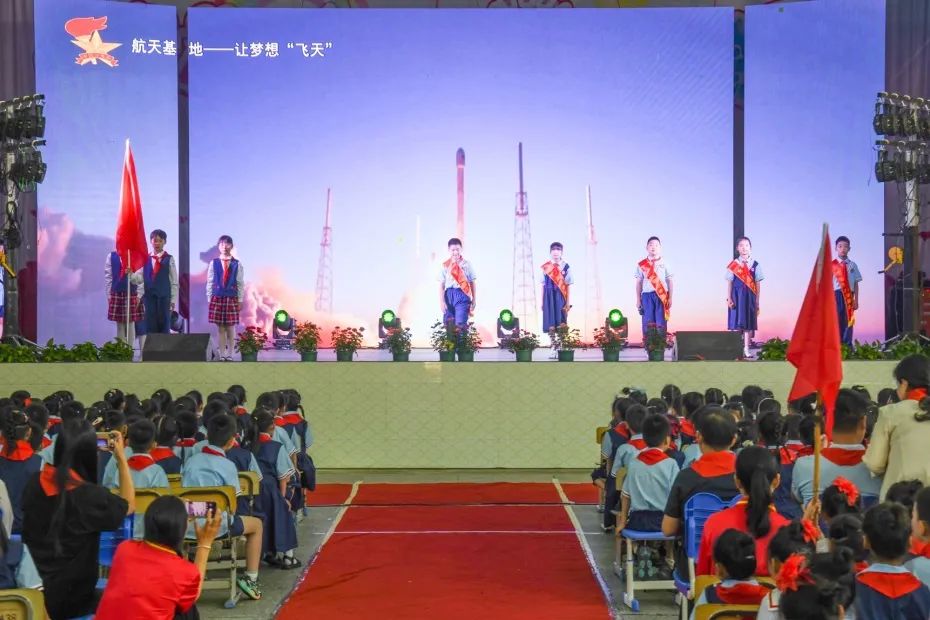 在激昂的鼓号声中,队旗缓缓而出,拉开活动序幕。全体少先队员和着鼓号队的节奏,唱响队歌,唱出新时代少先队员昂扬进取的精神面貌。