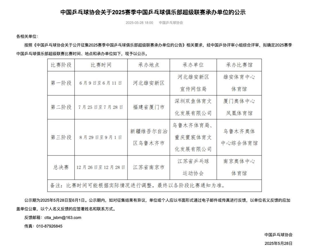 5月28日,中国乒协官网发布了2025赛季中国乒乓球俱乐部超级联赛承办单位的公示,公示期为2025年5月28日至6月1日。