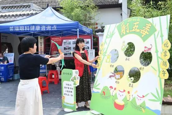 活动现场设置了暖心义诊、手制漆扇、“射五毒”趣味游戏三个环节。在暖心义诊区,医生认真地为居民们进行眼部、口腔等常规检查,并耐心解答居民们提出的各种健康问题。在制作漆扇环节,居民们在社区志愿者的指导下,将漆液滴入水中,勾画改变大漆的纹路,再持团扇,轻缓入水,制作出了一把把精美的漆扇艺术品。在“射五毒” 游戏区,辖区居民面向画有蝎子、毒蛇、蜈蚣、壁虎、蟾蜍的靶子,手持箭矢,站在指定位置全神贯注投射,在弓弦起落中感受非遗魅力。