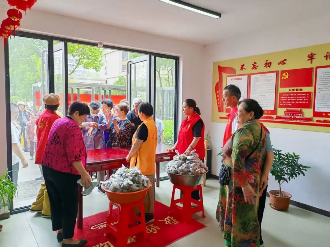 在太湖新村小区梧桐邻里党群服务站内,居民与志愿者们齐聚一堂一起制作粽子。志愿者们细心指导着居民们包粽子的技巧,大家认真学习,不断尝试,捋粽叶、做漏斗状、填糯米、压紧实、封口、扎捆,不一会儿功夫,三角形、枕头形、长条形等一个个各式各样的漂亮粽子瞬间成型。包好粽子后,志愿者们在门口摆上台子,为来往居民分发粽子和艾草花束,并讲解端午挂艾、佩香囊等习俗的文化内涵以及端午民俗知识。同时,还结合“窗帘之约”活动上门为辖区高龄老人、独居老人、低保家庭等困难群体送粽子、艾草花束并送上节日的祝福,表达社区对他们的关心和爱护。