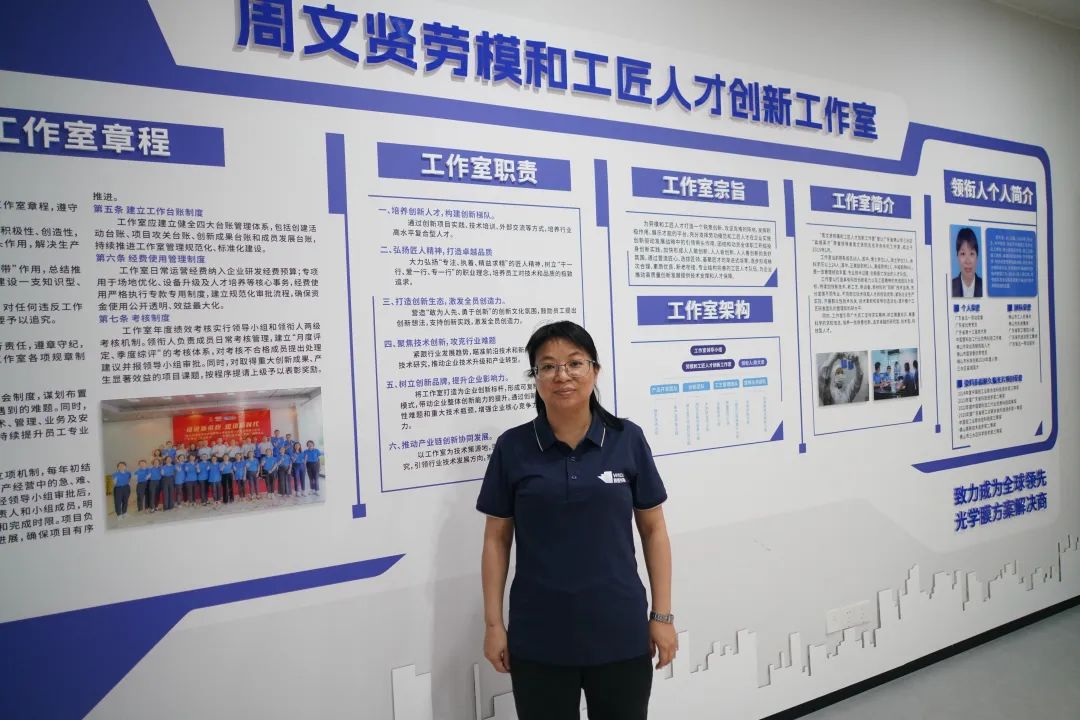 2016年,周文贤团队研发的首批高耐久偏光片顺利通过20家客户测试,性能指标比肩进口产品。这项突破,让纬达光电成为国内首家掌握中灰高耐久染料系偏光片量产技术的企业。随后,该产品实现大批量生产,更借势“一带一路”远销欧亚市场。“一个人可以走得很快,但一群人才能走得更远。”周文贤深知科技创新需要集体智慧。2019年1月,“周文贤劳模与工匠人才创新工作室”正式挂牌,开启技术传承的系统工程。