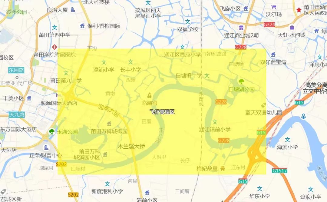 荔城区玉湖公园至涵江区白塘湖沿河道周边区域划定为低空飞行安全管理区。