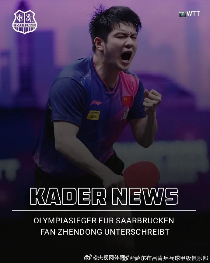 6月1日,据央视网体育消息,德甲联赛萨尔布吕肯乒乓球甲级俱乐部宣布,奥运冠军樊振东加盟。在俱乐部官方声明中,樊振东表示:我真的很期待在萨尔布吕肯和德甲的新挑战,体验新的环境——并与球队一起赢得更多的胜利。