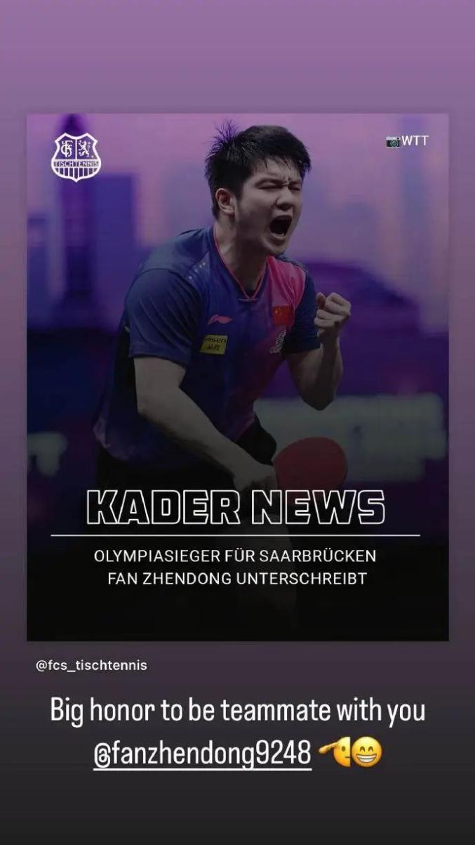 6月1日,德甲萨尔布吕肯俱乐部通过社交媒体宣布中国运动员樊振东加盟该俱乐部,征战2025-2026赛季德国乒乓球甲级联赛和欧洲冠军联赛。