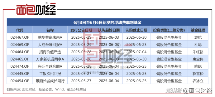 值得关注的是,6月3日至6月6日共有7只浮动费率产品开启发行,包括鹏华共赢未来A、工银泓裕回报、景顺长城成长同行等产品。