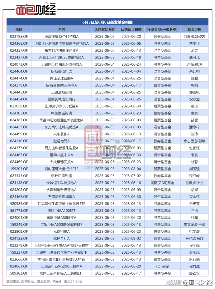 截至5月30日数据,按认购起始日统计,6月3日至6月6日,公募基金市场将有35只新基金(仅统计初始基金口径并剔除转型及和后分级基金,下同)面市,涉及25家基金公司,平均募集期约19天。
