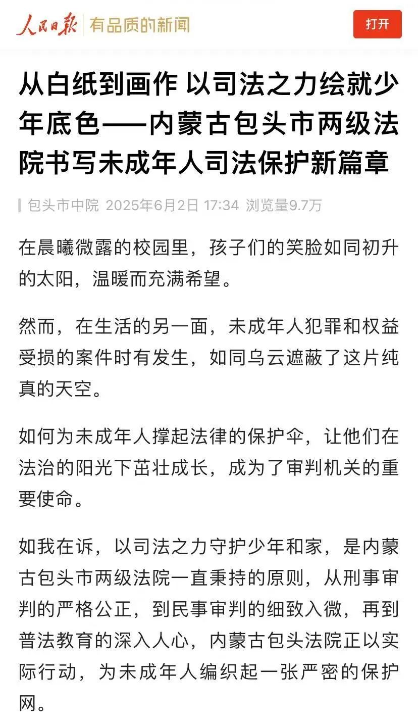 6月2日,人民日报刊登《从白纸到画作 以司法之力绘就少年底色——内蒙古包头市两级法院书写未成年人司法保护新篇章》一文。以下为全文。