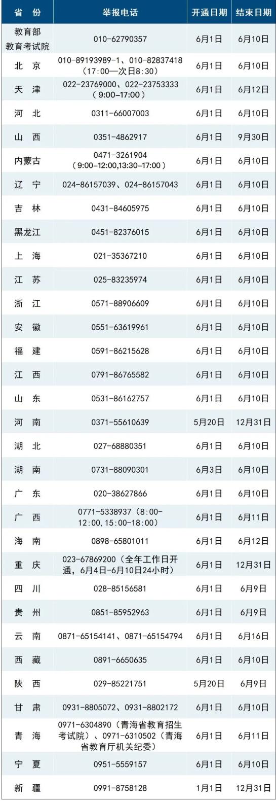 近日,教育部统一公布了教育部以及各省(区、市)2025年的高考举报电话,欢迎广大考生、家长及社会各界人士及时举报反映涉及2025年高考的问题线索。教育部及各省(区、市)将会同有关部门根据举报线索第一时间核查处理,坚决维护高考公平公正。