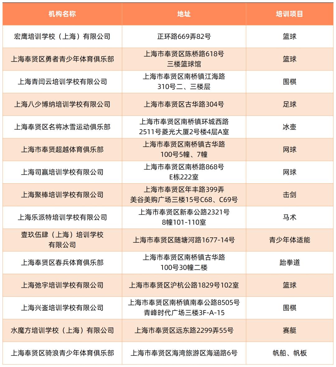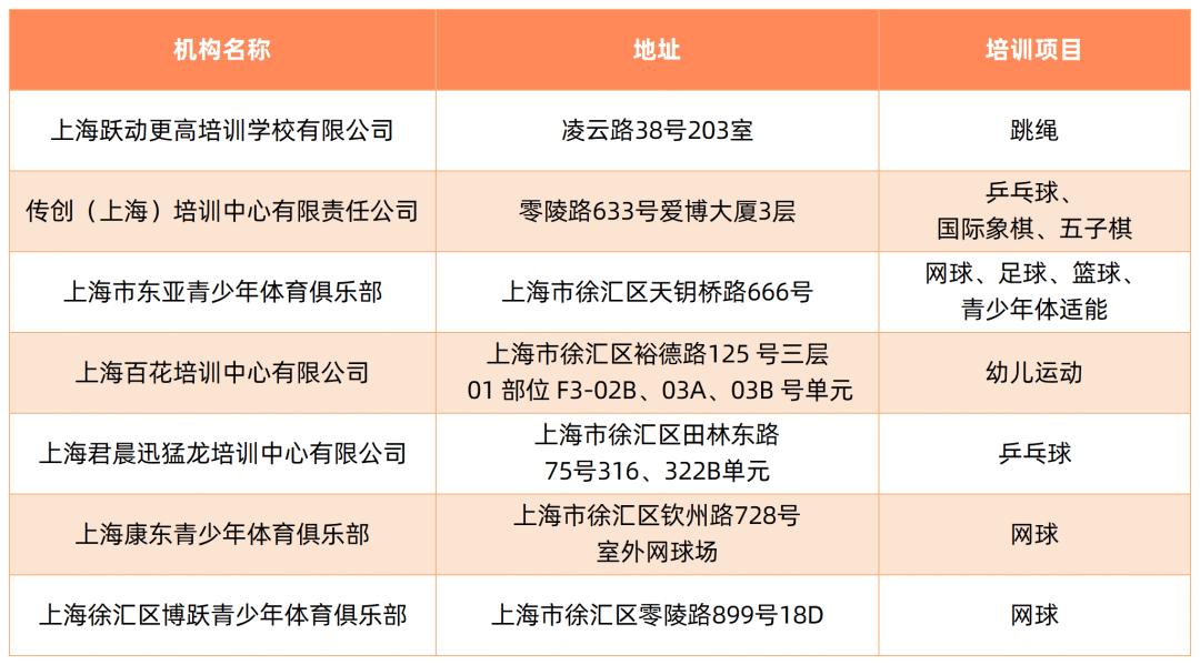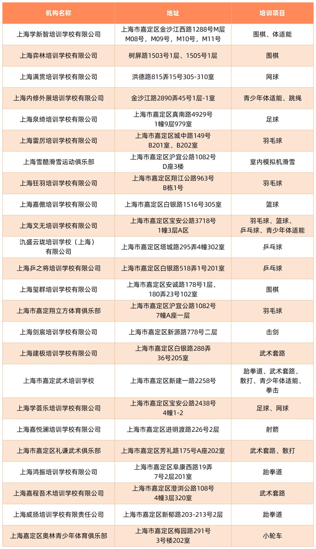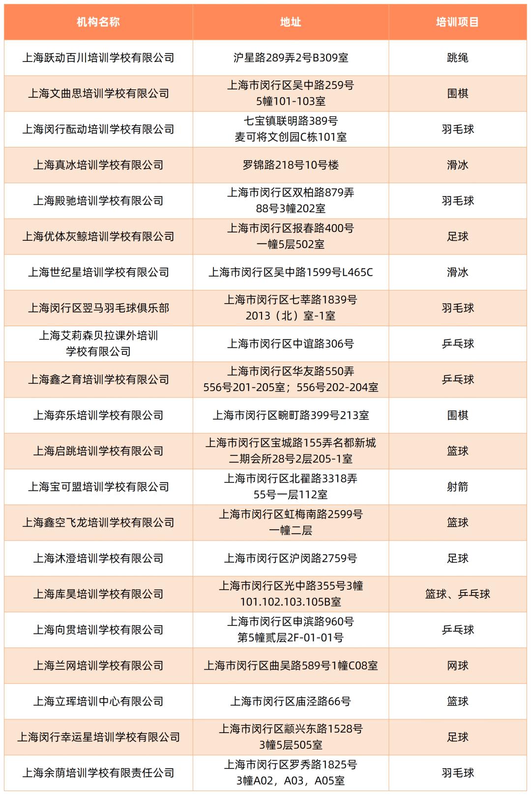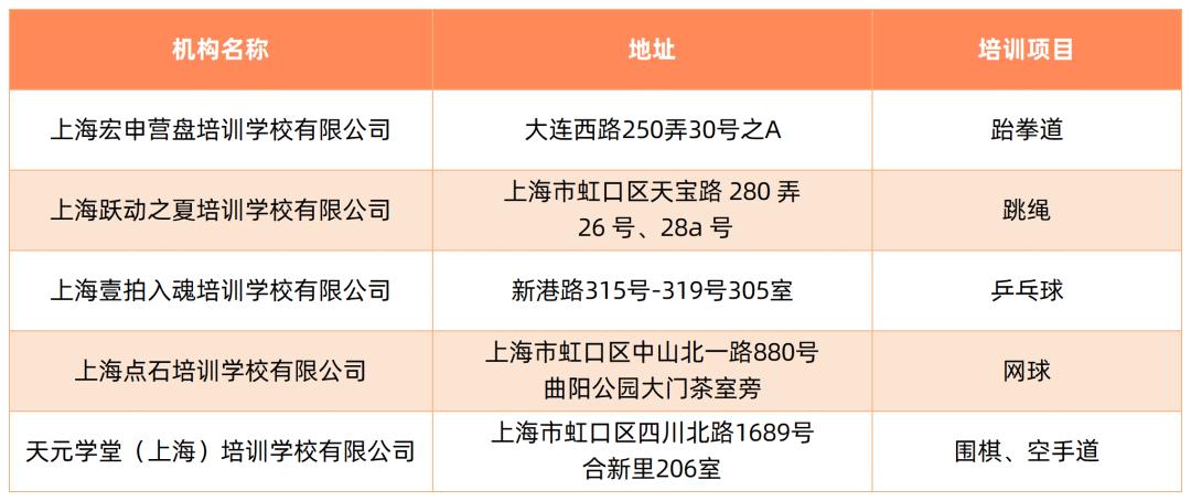 截至5月,本市取得民办学校办学许可证的体育校外培训机构如下: