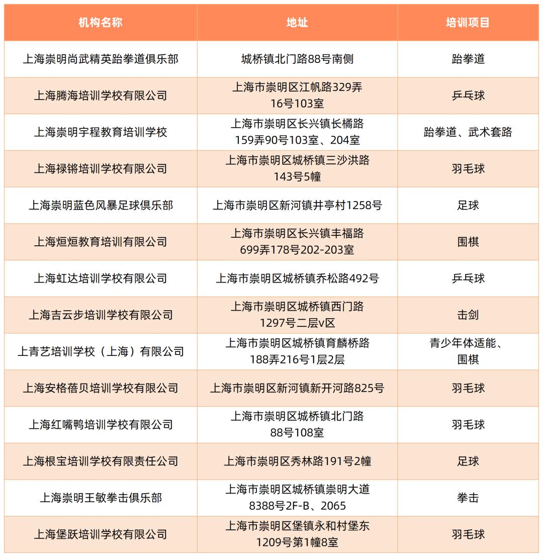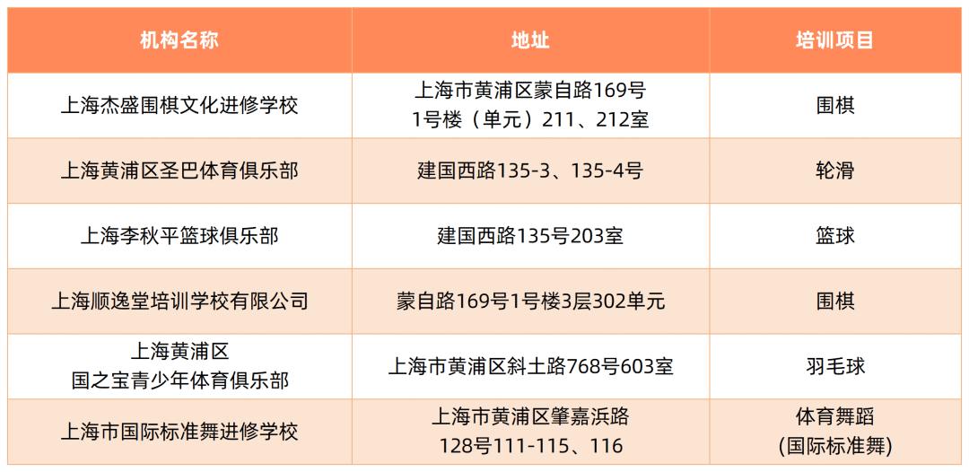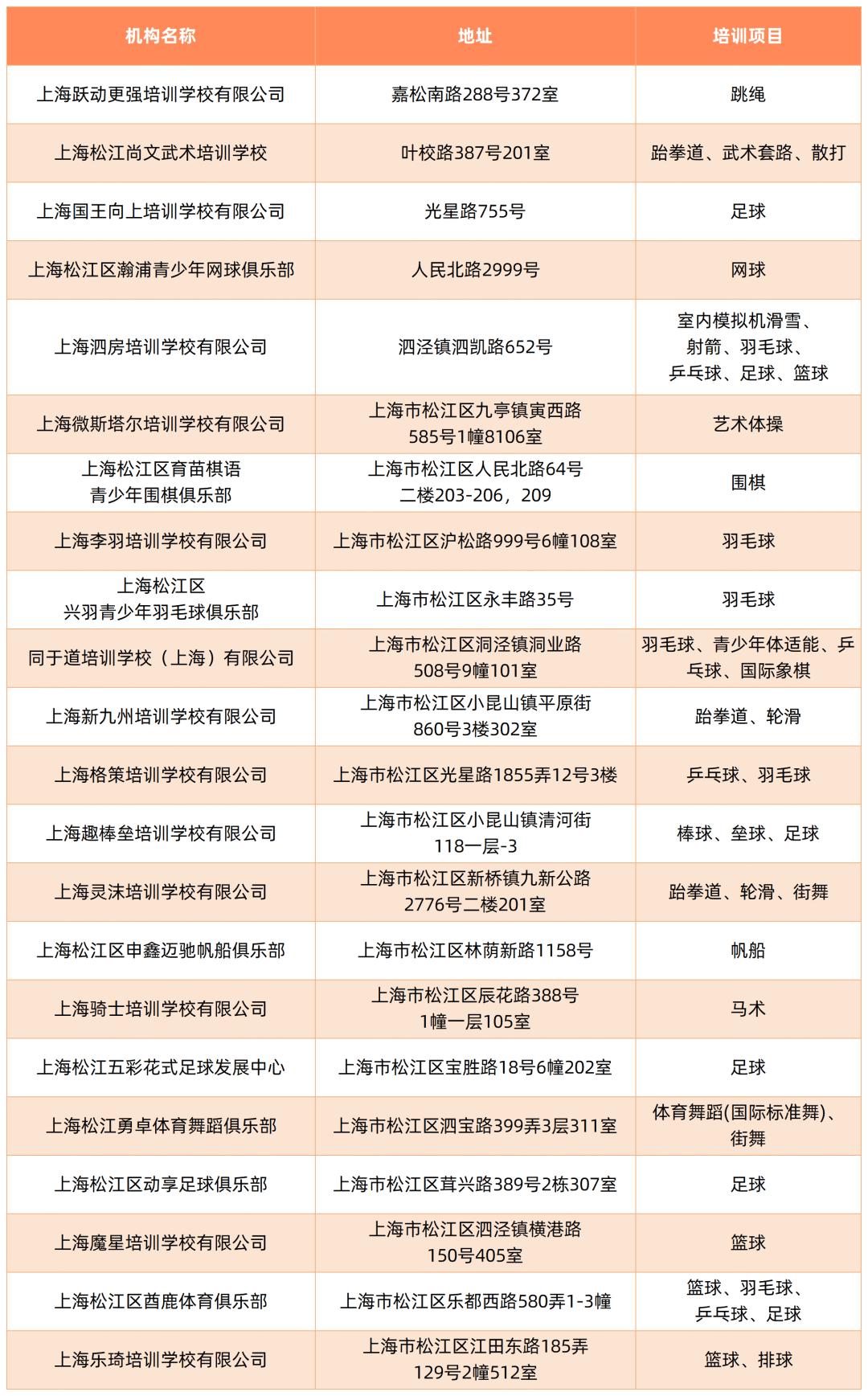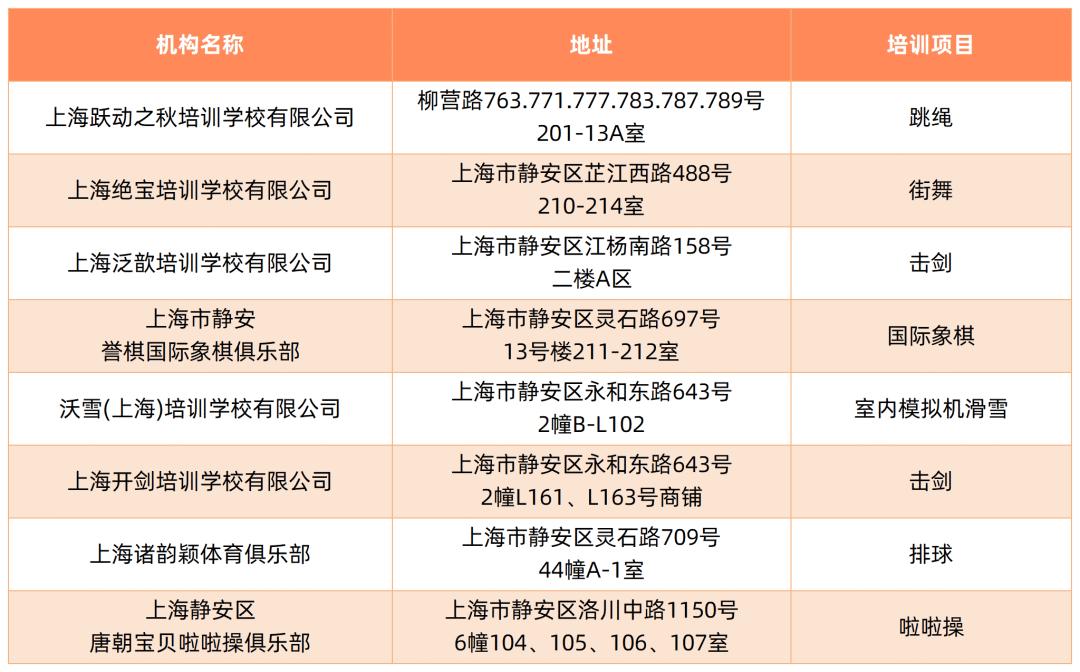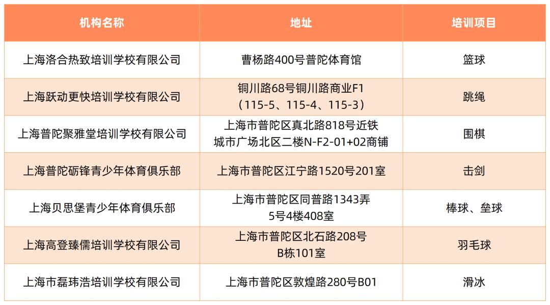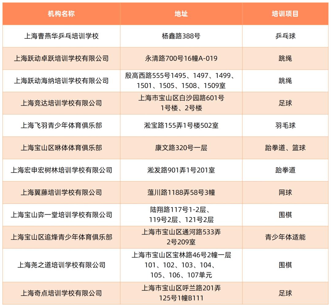 截至5月,本市取得民办学校办学许可证的体育校外培训机构如下: