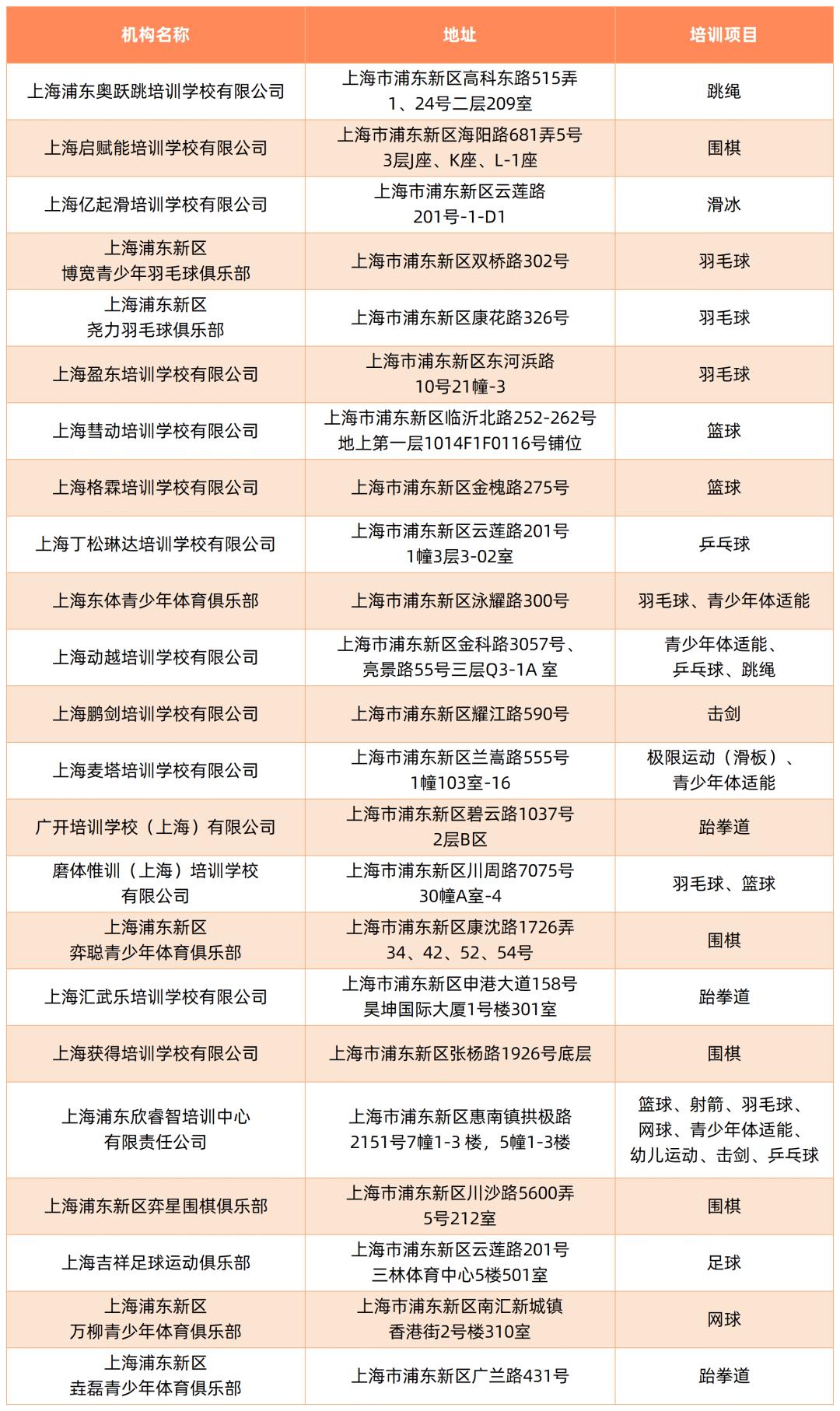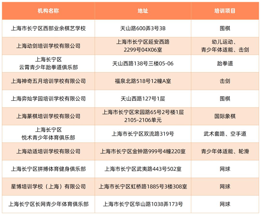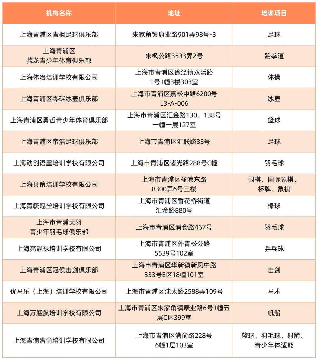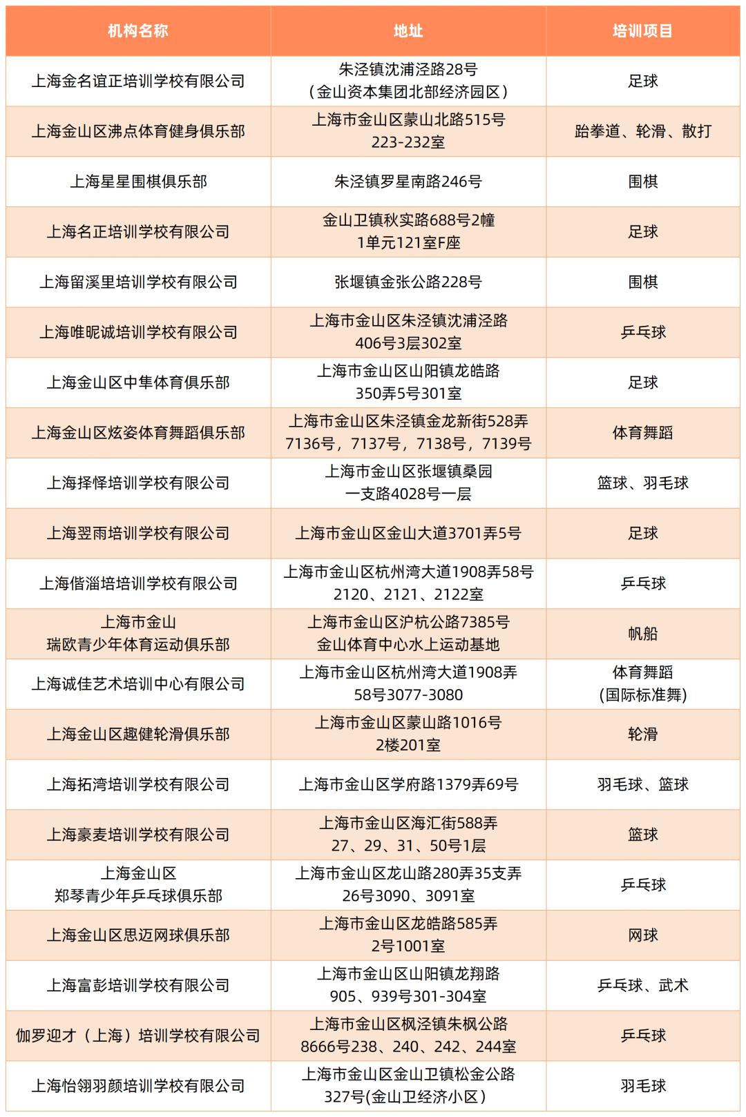 截至5月,本市取得民办学校办学许可证的体育校外培训机构如下: