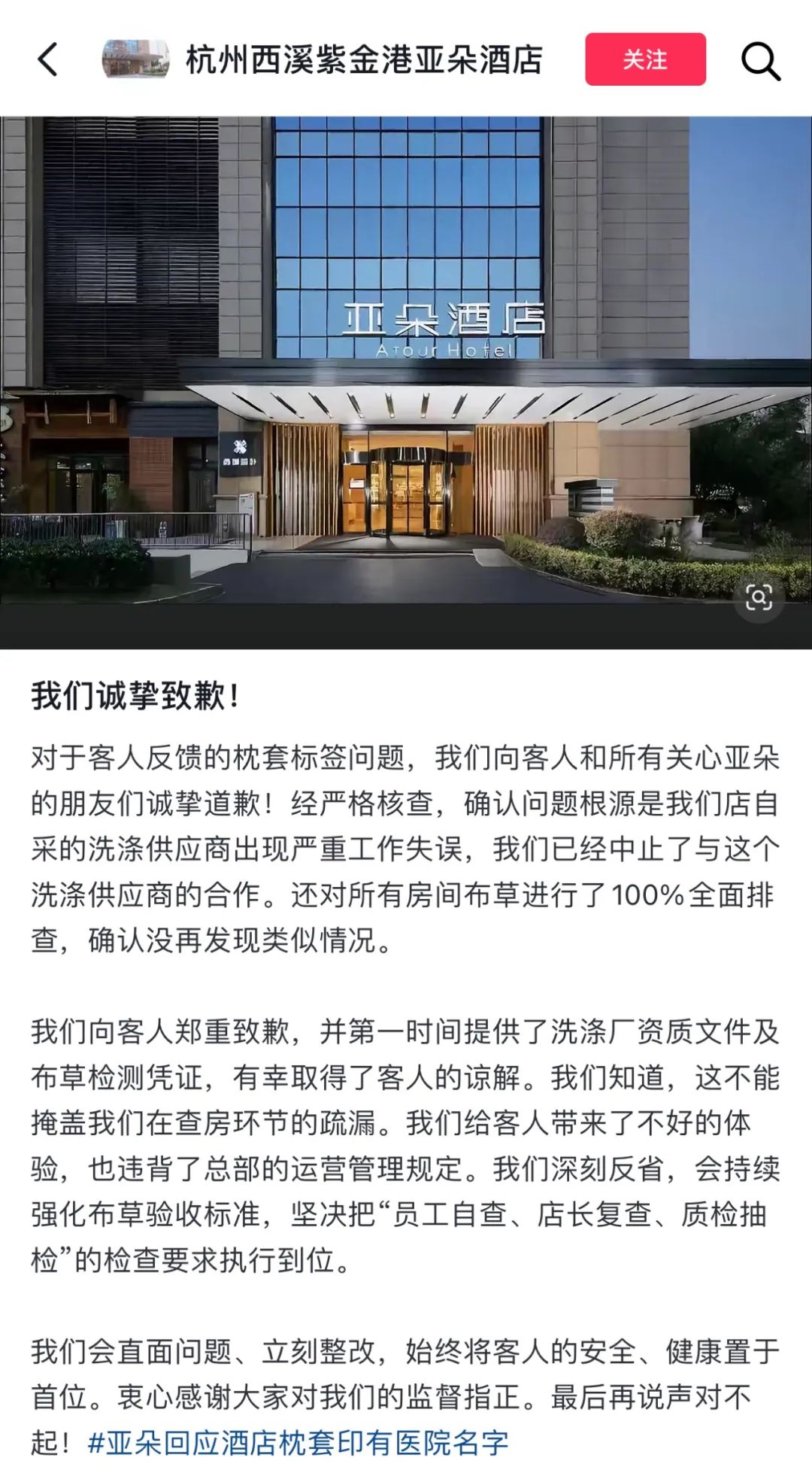 对于客人反馈的枕套标签问题,我们向客人和所有关心亚朵的朋友们诚挚道歉!经严格核查,确认问题根源是我们店自采的洗涤供应商出现严重工作失误,我们已经中止了与这个洗涤供应商的合作。还对所有房间布草进行了100%全面排查,确认没再发现类似情况。
