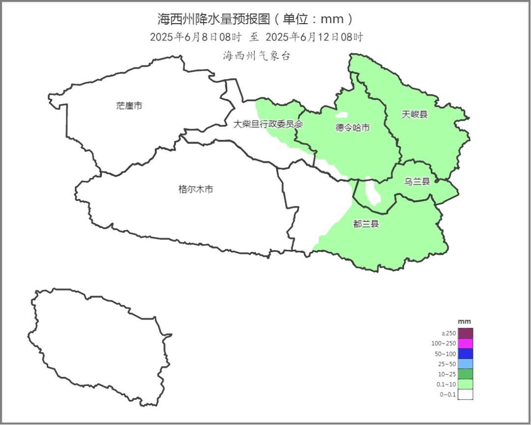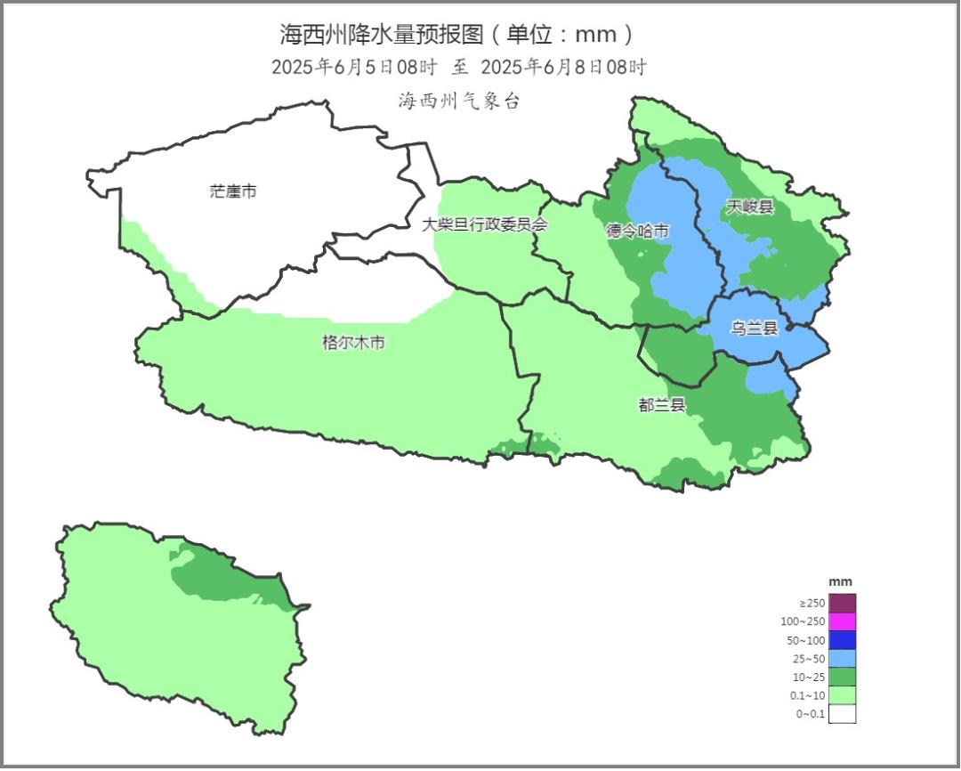 受冷空气和西南暖湿气流共同影响,预计6月5日至7日德令哈东部、都兰东北部、乌兰大部、天峻大部有中到大雨(20~45毫米),其余地区小到中雨(0.1~15毫米),较大降水集中在5日夜间至6日夜间,最大小时雨强8~15毫米;高海拔山区降水相态复杂,存在雨雪转换。