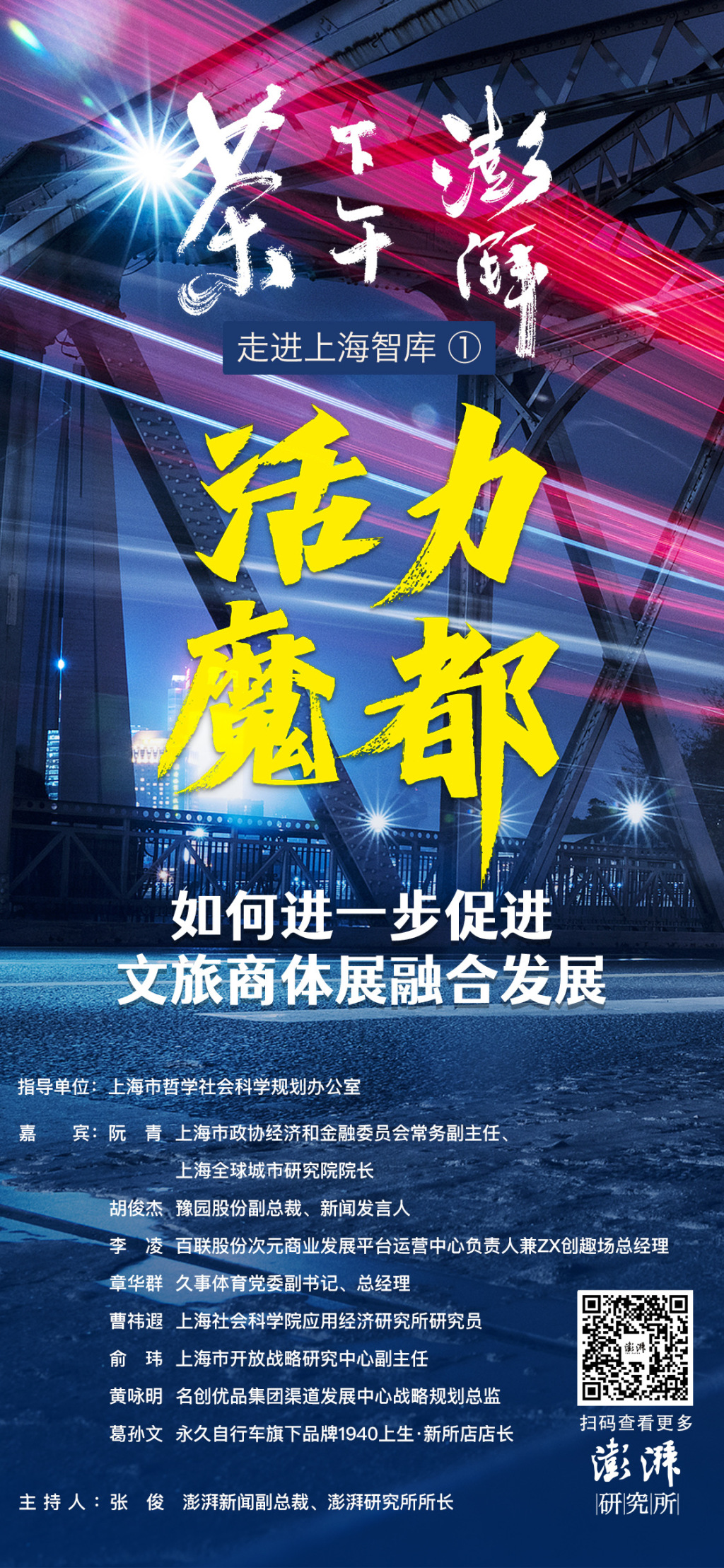 澎湃新闻副总裁、澎湃研究所所长张俊介绍说,本次研讨会是“澎湃下午茶”走进上海智库的第一场,是推动智媒融合发展的新举措。首场活动以文旅商体展融合发展作为讨论主题,因为文旅商体展在拉动消费上越来越重要。张俊说,文旅体商展融合发展,还可以再加上“智”——智库,“媒”——媒体,七方联动。