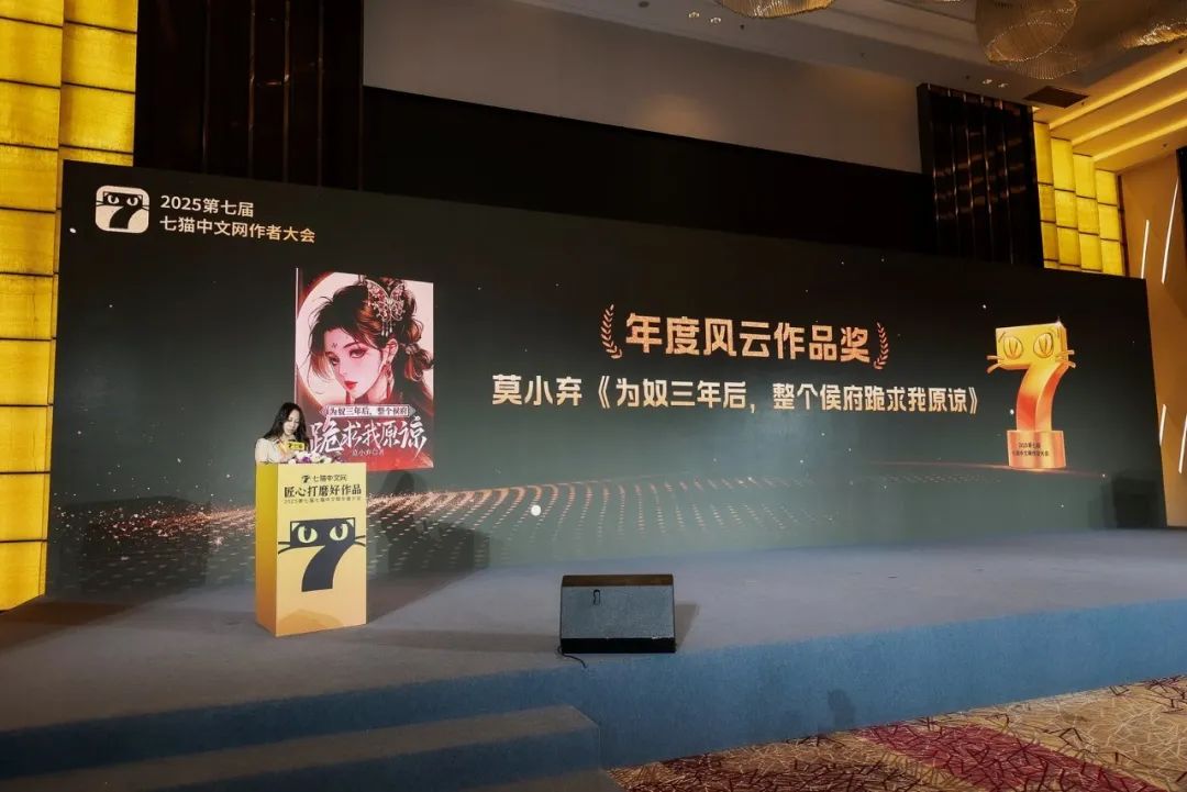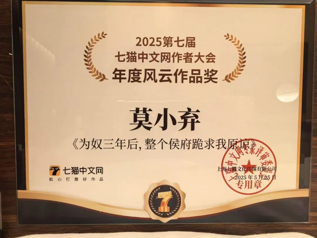 《为奴三年后,整个侯府跪求我原谅》,这部由长兴作协主席团成员、网络作家莫小弃(笔名)创作的网络小说,最近是真的火了。这篇已更新至130万字的网络文学(以下简称“网文”),日前荣获七猫(网文平台)年度风云作品奖。年度风云作品奖为七猫作者大会的最高奖项,本次获奖的作品全国仅七部。莫小弃作为获奖代表,上台分享获奖感言。