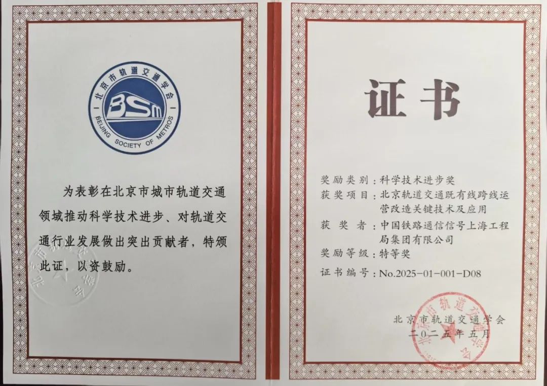 近日,2024年度北京市轨道交通学会科学技术进步奖评选结果公布,中国通号2项创新成果斩获殊荣。其中,“北京轨道交通既有线跨线运营改造关键技术及应用”项目荣获2024年度北京市轨道交通学会科学技术进步奖特等奖,“自主化全电子联锁系统关键技术研发及产业化应用”项目荣获一等奖。