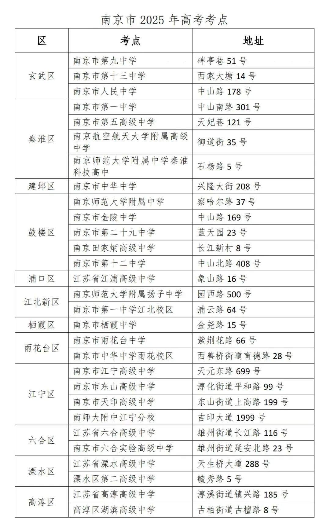 今年高考,南京市共有29处考点,位于雨花台区育德路28号的中华中学雨花校区是主城区唯一新增考点。据了解,该校区是首次作为高考考点,将迎来约900名考生,其中600余人来自外校。交管部门提醒,如果是打车或者导航驾车出行,需注意区分位于建邺区的中华中学兴隆校区考点(兴隆大街208号)。