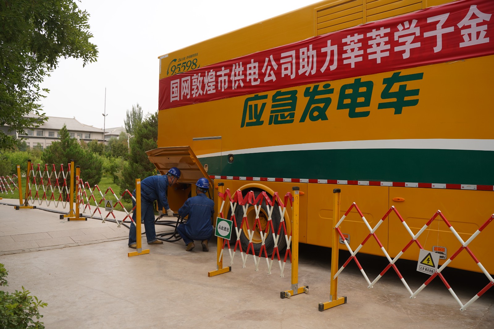 图为:国网敦煌市供电公司工作人员提前进入敦煌中学考点对发电车进行接入,逐一对教学楼、广播站、监控室等用电设备进行安全隐患排查。(尚丽娜 摄)