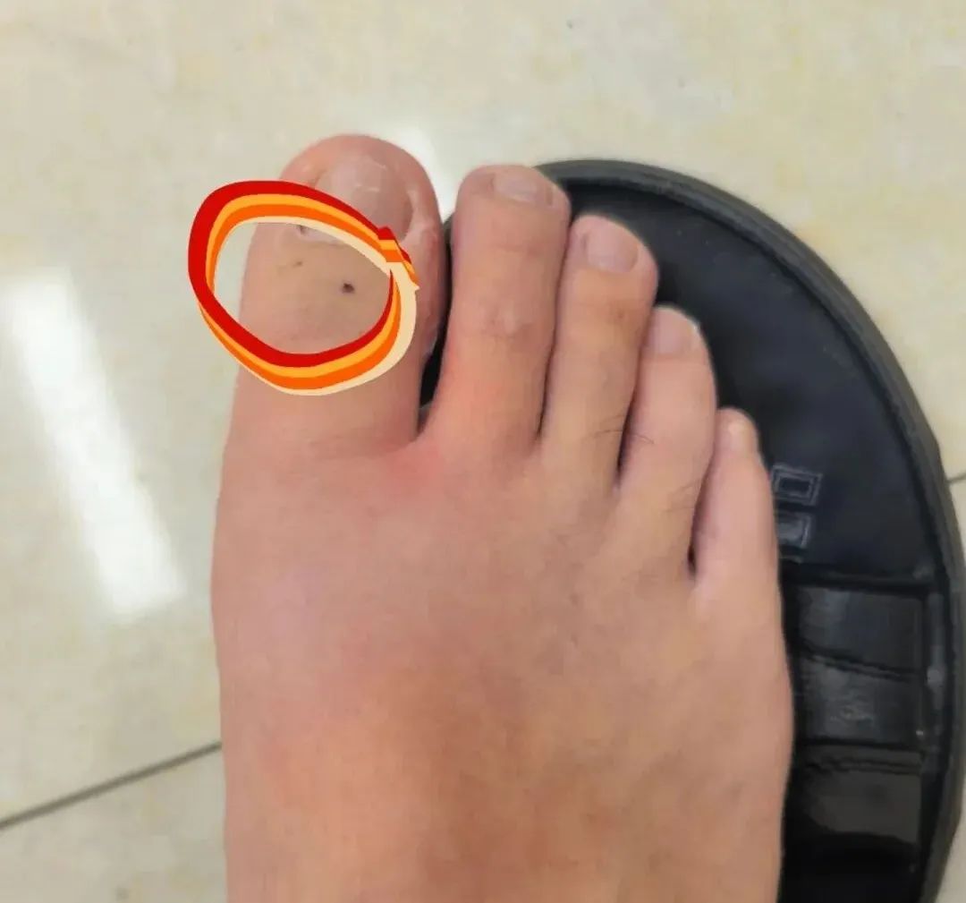 在黄先生提供的图片上记者看到,他躺在病床上,右脚上缠着纱布。还有照片显示,右脚大拇指上有两个明显的小眼。