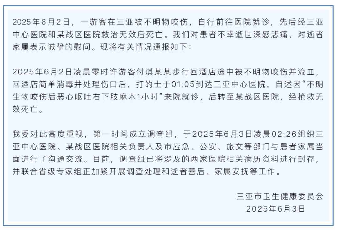 6月3日,三亚市卫健委发布情况通报称,6月2日凌晨,游客步行回酒店途中被不明物咬伤并流血,回酒店简单消毒并处理伤口后,于1:05到达三亚中心医院,自述因“不明生物咬伤后恶心呕吐右下肢麻木1小时”来院就诊,后转至某战区医院,经抢救无效死亡。两家医院相关病历资料已被封存,正联合省级专家组开展调查。