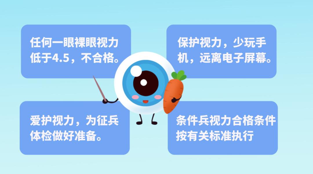 (3)视力:任何一眼裸眼视力不低于4.5。任何一眼裸眼视力低于4.8,需进行矫正视力检查,任何一眼矫正视力低于4.8或矫正度数超过600度,不合格。屈光不正经准分子激光手术(不含有晶体眼人工晶体植入术等其他术式)后半年以上,无并发症,任何一眼裸眼视力达到4.8,眼底检查正常,合格(除条件兵外)。条件兵视力合格条件按有关标准执行。其他身体标准条件,应征青年可以登录全国征兵网首页查阅《应征公民体格检查标准摘要》了解详细内容。