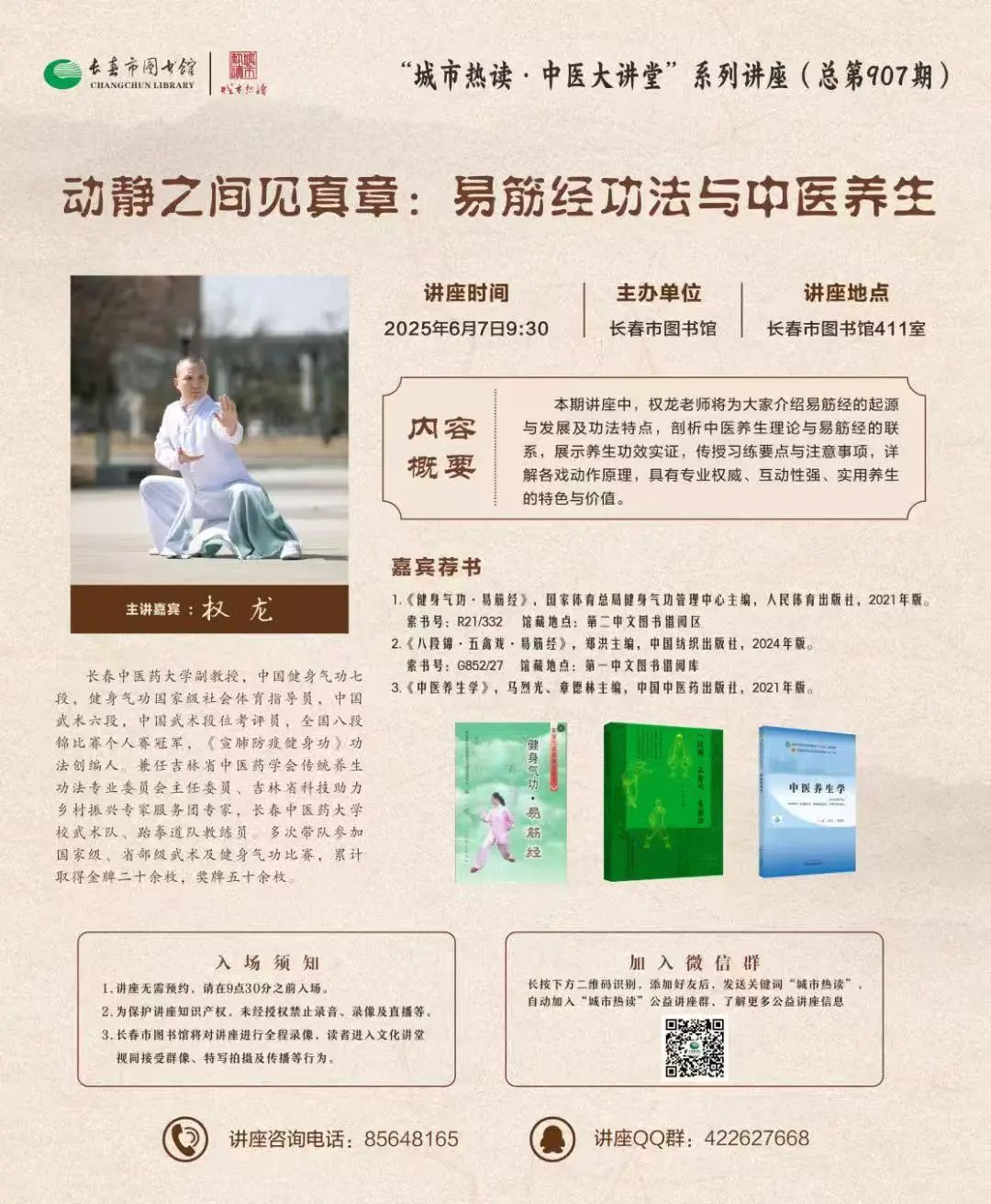 本期讲座具有专业权威、互动性强、实用养生的特色与价值。讲座中,大家将了解到易筋经的起源与发展及功法特点,中医养生理论与易筋经的联系,养生功效实证,习练要点、注意事项及动作原理。