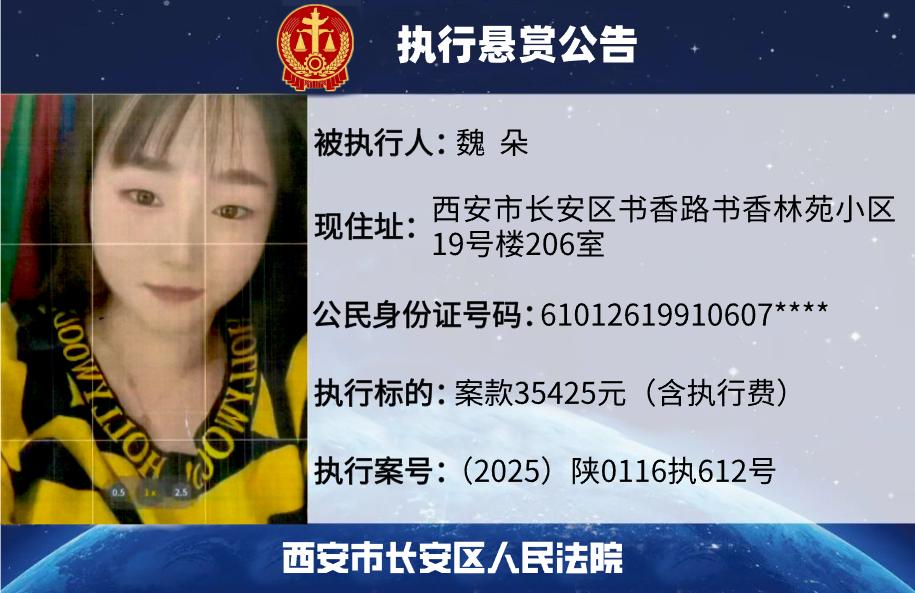 悬赏事项:举报人提供被执行人魏朵可供执行财产线索,经法院查证属实并实际执行到位,符合执行悬赏的相关规定(法院已查控的被执行人财产不属于悬赏范围),申请执行人在债权得以实现后,承诺自愿支付基于财产线索属实所执行到位款的10%作为悬赏金。悬赏期限:自本公告发布之日起至本案全案执行完毕为止。