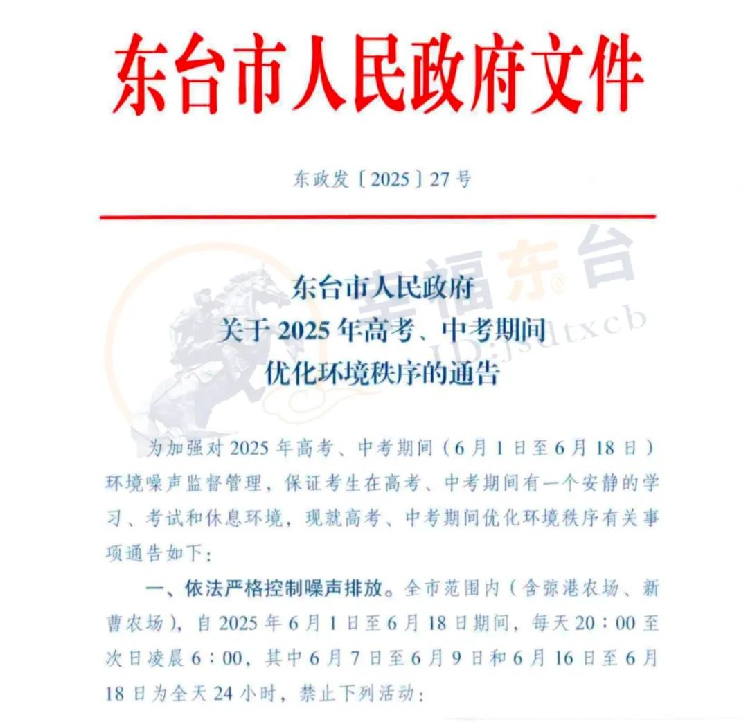 为加强对2025年高考、中考期间(6月1日至6月18日)环境噪声监督管理,保证考生在高考、中考期间有一个安静的学习、考试和休息环境,现就高考、中考期间优化环境秩序有关事项通告如下: