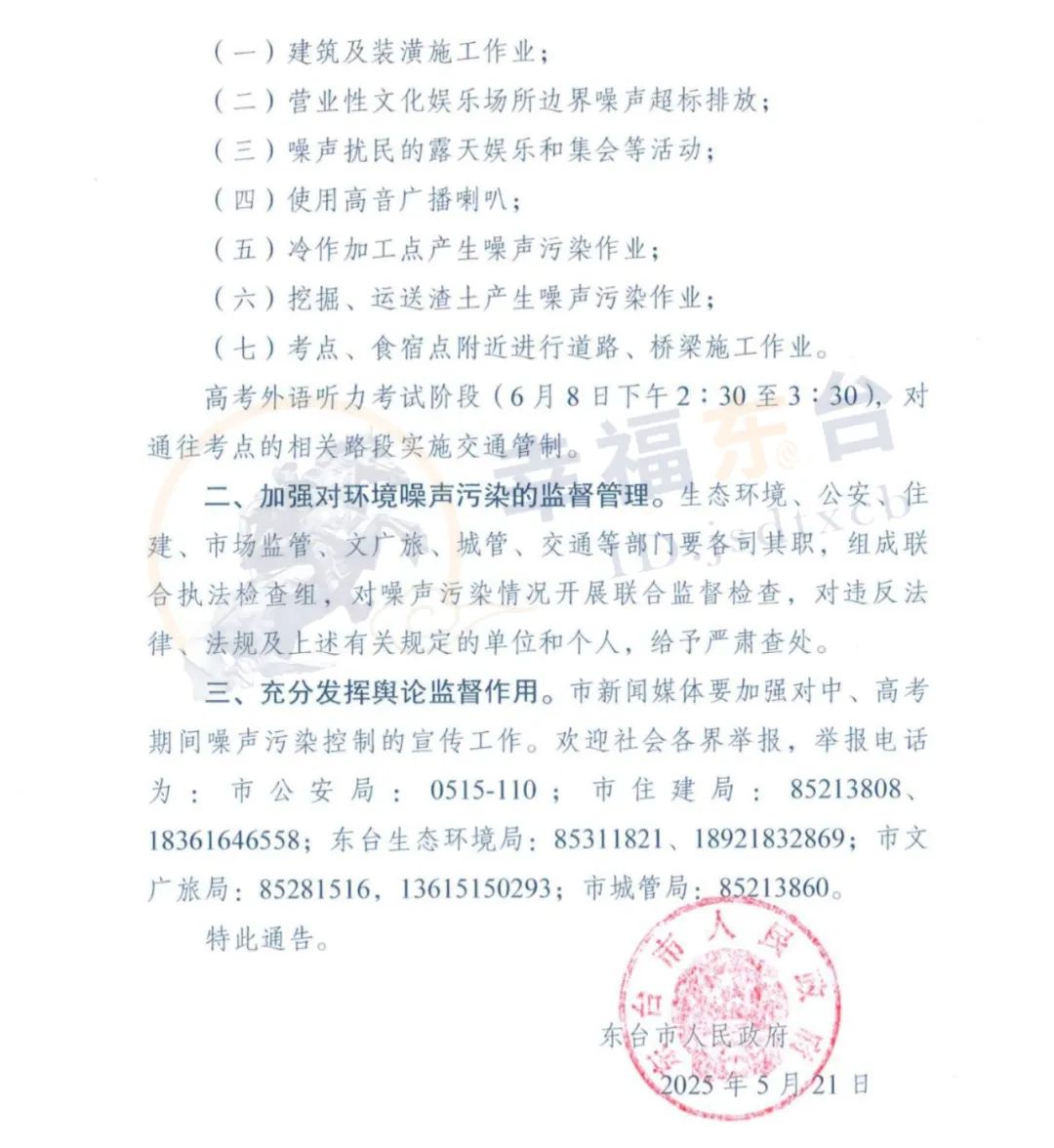 东台市人民政府关于2025年高考、中考期间
