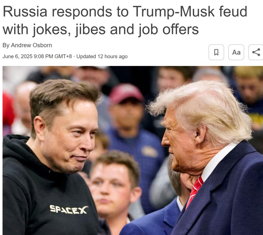 环球时报向上滑动看下一个原标题:《俄方回应特朗普马斯克“吵架”》