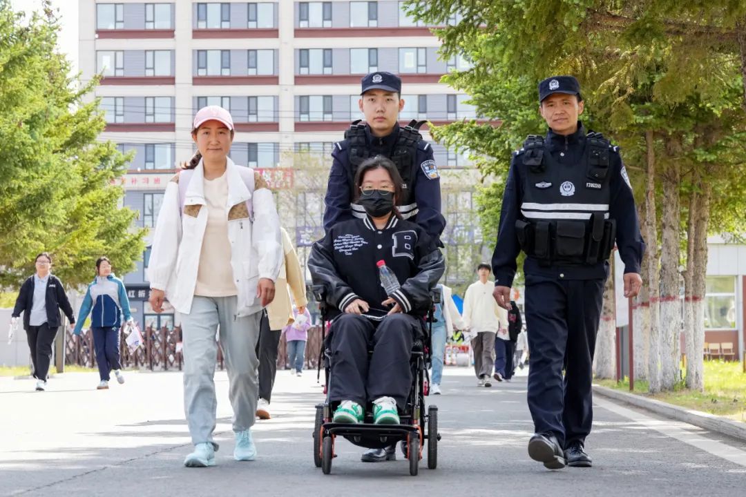 在阿荣旗第一中学考点,一名拄拐考生在家长搀扶下缓慢前行的身影引起了执勤民警的注意。民警迅速上前询问,得知该考生因脚踝扭伤行动不便。民警当即决定用警车护送考生前往考点,并安抚家长:“放心吧,我们一定把她安全送进考场。”抵达考点后,民警贴心地推来轮椅,由两名女警全程护送。经过正常检查流程,民警一直将考生护送至教学楼的班级内,为考生顺利考试提供了坚实保障。这些暖心的护考故事,只是呼伦贝尔公安高考安保工作的缩影。考试期间,呼伦贝尔公安提前谋划、周密部署,在各考点周边加强巡逻防控、交通疏导,同时设立临时服务点,为考生和家长提供应急帮助,全力营造安全、有序、温馨的考试环境。