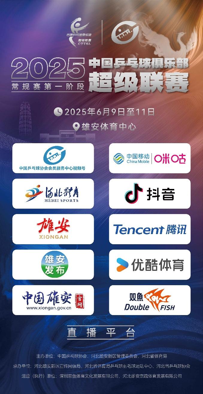 2025赛季中国乒乓球俱乐部超级联赛常规赛第一阶段将于6月9日至11日在河北雄安新区雄安体育中心体育馆进行,比赛将通过多个平台全程转播。
