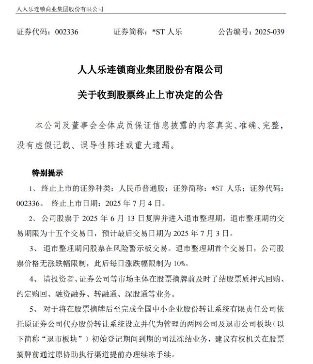 公告显示,*ST人乐股票将于6月13日复牌并进入退市整理期,退市整理期为十五个交易日,预计最后交易日期为7月3日。终止上市日期为7月4日。