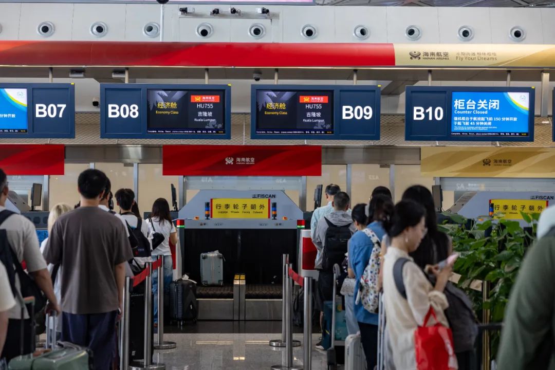 旅客排队办理值机手续。图源于海口美兰国际机场新航线上线!5月7日,海南航空HU7911海口⇌伦敦航班从海口美兰国际机场起飞,海南自贸港首条直飞英国伦敦客运航线正式通航,单程飞行时间较此前中转航线减少约4.5小时。