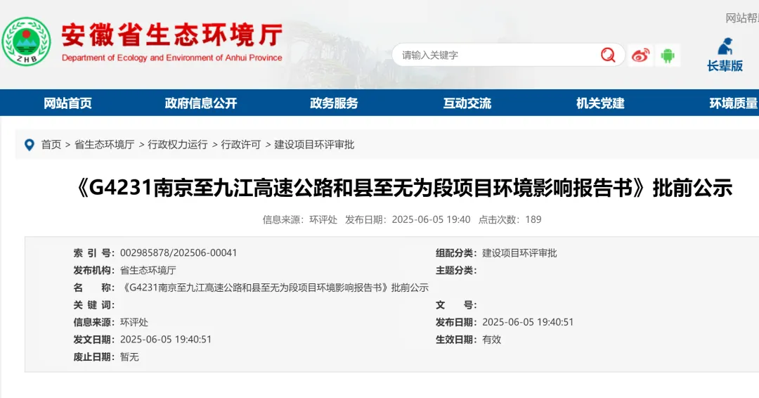 6月5日,安徽省生态环境厅发布《G4231南京至九江高速公路和县至无为段项目环境影响报告书》批前公示,标志项目审批进入关键阶段、履行环保公众监督等法定程序。