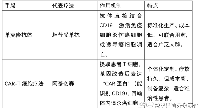 CD19单抗与CAR-T疗法对比。(中国商报记者 马嘉/制图)